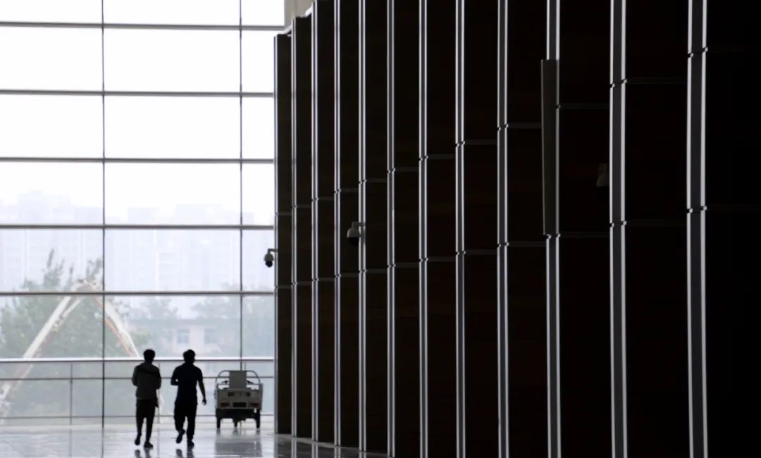 6月16日,施工人员在北京丰台站候车大厅内进行工程收尾工作。新华社记者 李欣 摄