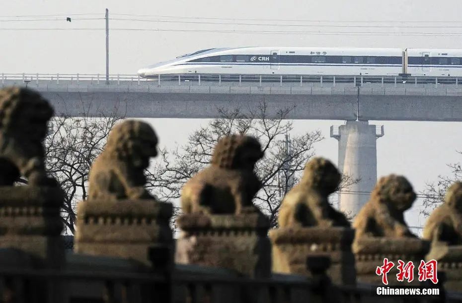 一列高铁列车正驶过北京卢沟桥畔的永定河铁路高架桥。中新社记者 崔楠 摄