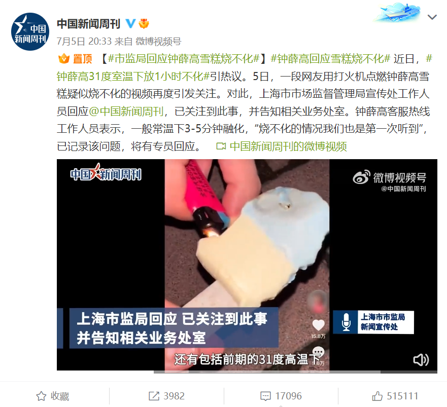 5日,一段网友用打火机点燃钟薛高雪糕疑似烧不化的视频再度引发关注。对此,上海市市场监督管理局宣传处工作人员回应,已关注到此事,并告知相关业务处室。