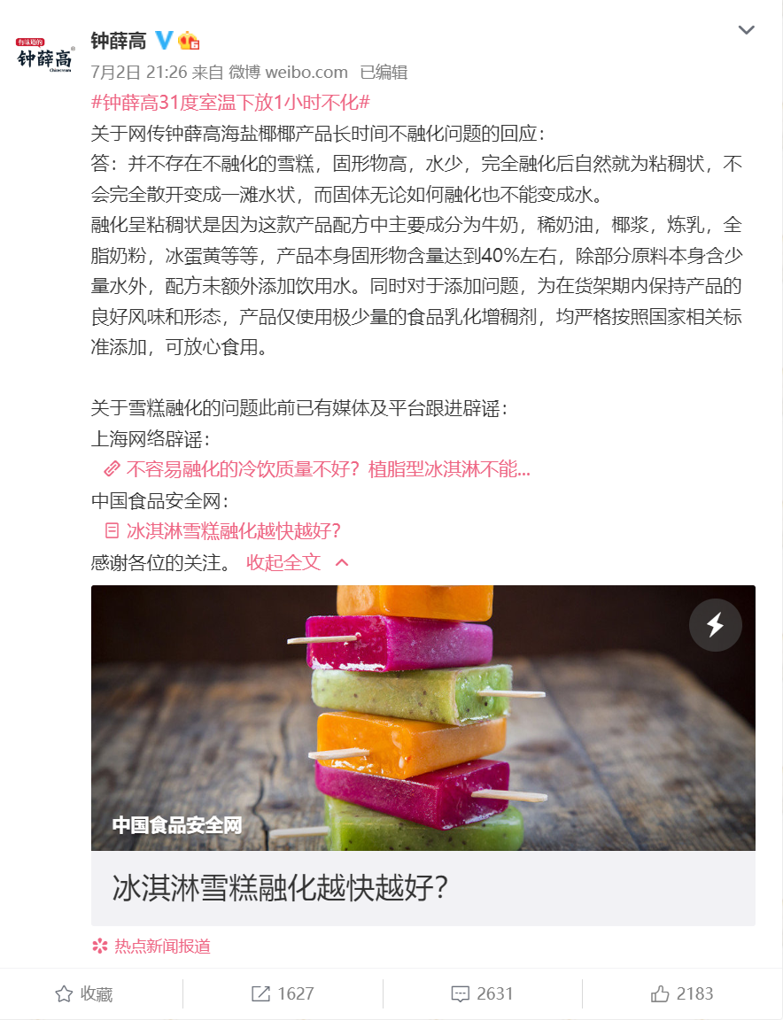 7月2日,@钟薛高 回应表示,为在货架期内保持产品的良好风味和形态,产品仅使用极少量的食品乳化增稠剂,均严格按照国家相关标准添加,可放心食用。