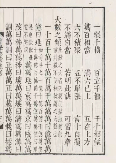 3000年前殷商甲骨文字中,除一、二、三、四、五、六、七、八、九,已有十、百、千、万的数字记载,它们都是十进位数,1万等于10的4次方。东汉徐岳的《数术记遗》(公元190年)非常完整地记载了中国表示数量的数词。这些数词有十、百、千、万、亿、兆、京、垓、秭、穰、沟、涧、正、载、极。从十到万是十进制。从万开始,便是万进制了,即万万为亿、万亿为兆、万兆为京……1亿等于10的8次方、1兆等于10的12次方、1京等于10的16次方,1极等于10的48次方。