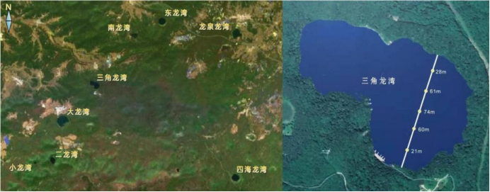 吉林省龙岗火山群“八龙湾”空间展布图(左图,原创图件)和三角龙湾火山俯瞰图(右图,图源于网络)