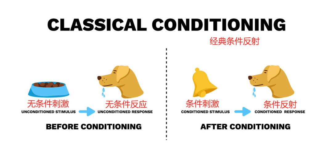 实验结果是,狗听到铃声后,会自然地分泌唾液。而这时候,铃声就不再只是“中性刺激”,而变成了“条件刺激”,引起唾液分泌则是“条件反应”。