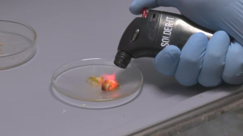 研究者试图点燃白色团子来观察其是否可燃 | Jeremy Eaton/CBC