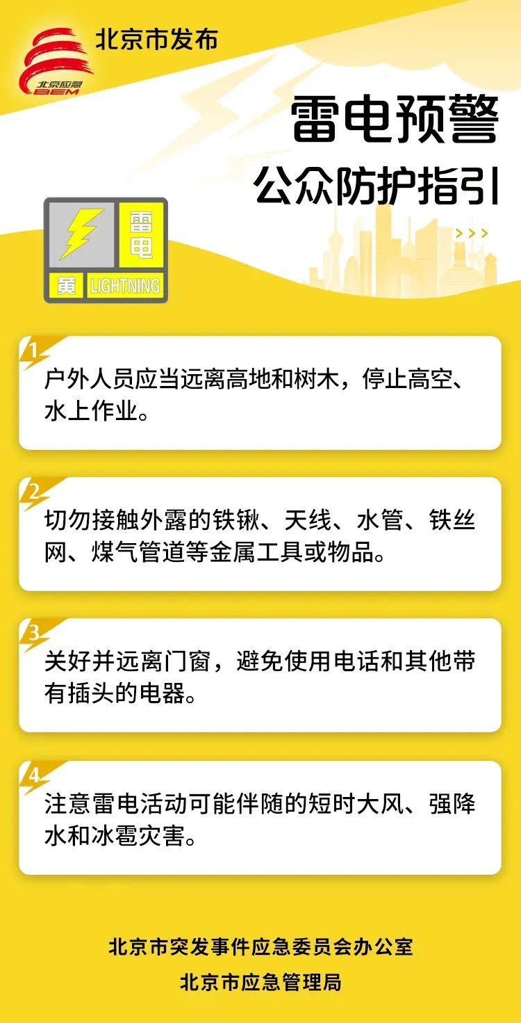 2025年5月13日15时30分,北京市发布雷电黄色预警信号。预计5月13日16时至5月14日08时,本市自西向东有雷阵雨天气,局地短时雨强较大,并伴有8级左右短时大风和冰雹。