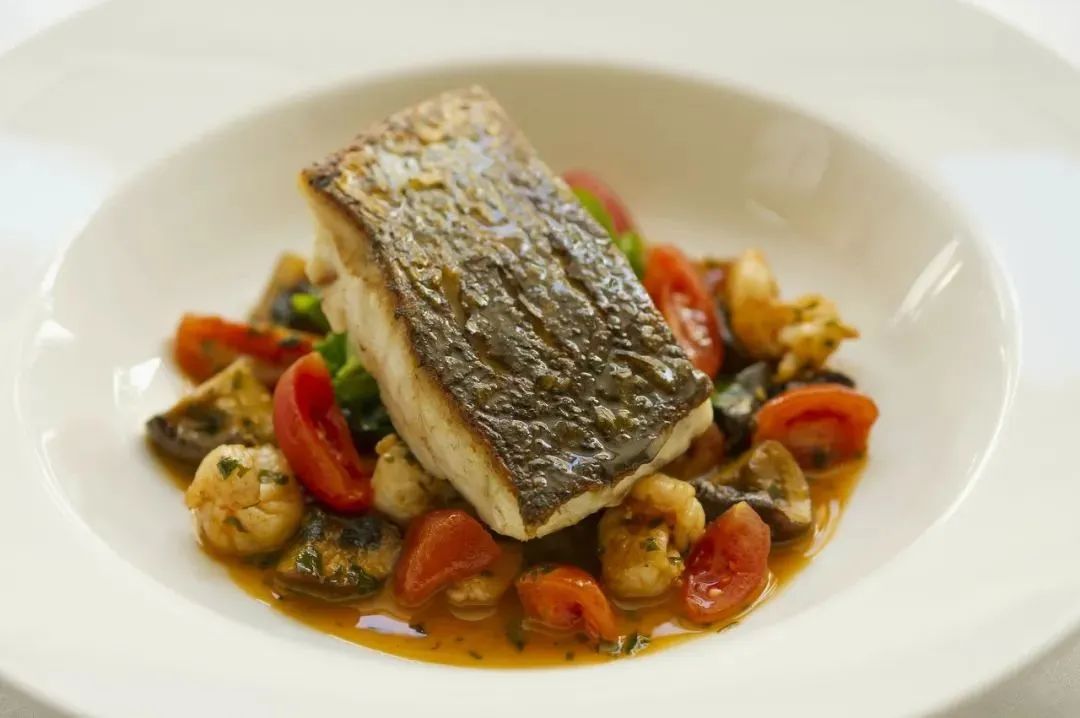 用番茄,蘑菇和荔枝做的鲈鱼片 | stockfood / 图虫创意