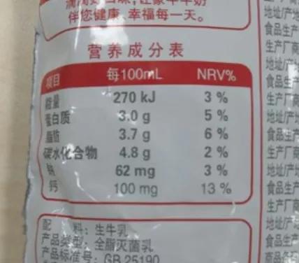 另外,从热量上来看,一袋200mL牛奶,全脂和脱脂的热量差值约为62kcal。如下图: