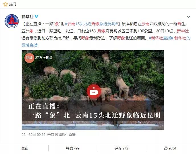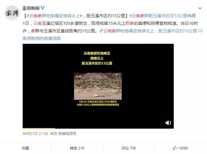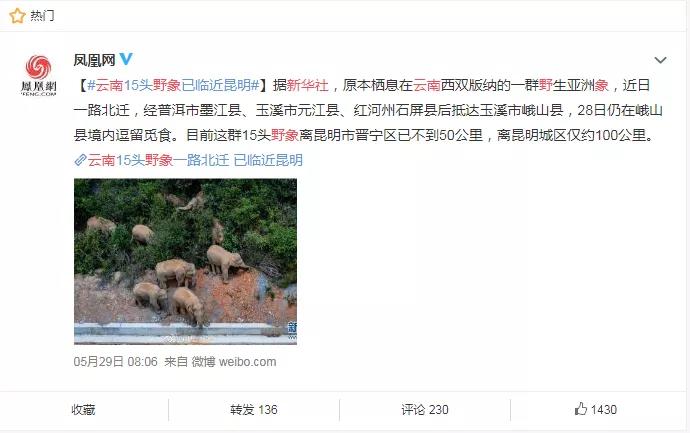 近日,15头野生亚洲象组成的象群沿着“西双版纳-普洱-红河-玉溪”一路向北逛吃逛吃,截止6月1日16时许,象群与玉溪市区的直线距离就剩下大约13公里,离昆明也是越来越近,这让网友不禁戏称:这是来昆明参加生物多样性大会吗?有不少朋友参与到关于此次野象北上事件原因的讨论中,有人认为是原有栖息地环境遭到了破坏,逼得大象们不得不出走;也有人认为是现在环境变好了,世界那么大,象要去看看;还有朋友认为,可能是大象们受到了某种惊吓,慌不择路,一路往北跑;更有网友调侃,大象是想要个编制,到昆明动物园安度晚年。