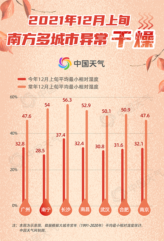 省会级城市中,像是广州、南宁、长沙、南昌、武汉、合肥以及南京,12月上旬的平均最小湿度几乎都徘徊在30%上下。尤其是南宁和合肥,连续6天(12月1日至6日)日最小相对湿度均小于25%,这在历史上十分少见,其中合肥为近30年连续干燥日数最多,而南宁在12月观测史上也能排进历史前五。