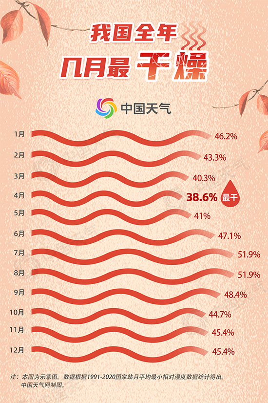 你以为眼下是最干燥的季节吗?其实不然,从常年(1991-2020年)国家站月平均最小相对湿度数据来看,排在前三名的分别是4月、3月、5月。其中4月最干燥,平均最小相对湿度不足40%,而我们目前所在的12月,位居全年第六。为何春季是全年最干燥的季节?