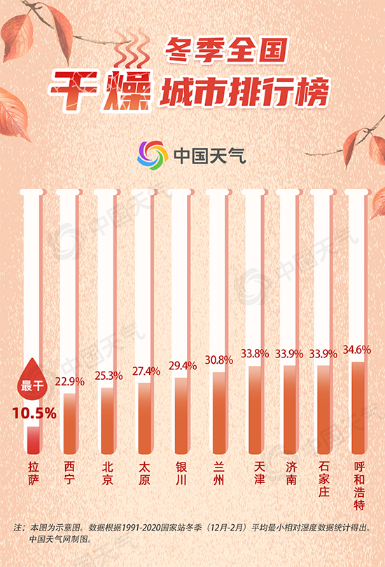 从中国天气网冬季全国干燥城市排行榜可以看出,前十名均是北方城市。拉萨气候属高原温带气候区,由于海拔高、冬季降水量少且平均日照时间长,即使产生降水也容易蒸发,因此非常干燥。而西北地区的西宁、银川、兰州深在内陆,属于温带大陆性气候,秋冬雨雪稀少,水汽条件差,且冬季更容易受寒冷干燥的冷空气影响,湿度低,因此也是十分干燥,上榜显而易见。