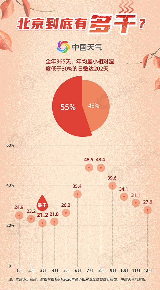 北京作为华北典型干燥城市的代表也挤进了前三甲。北京全年干燥的日数超一半,春季最干,平均最小相对湿度为23%;其次是冬季,平均最小相对湿度为25%。数据显示,北京常年(1991-2020年)年均最小相对湿度低于30%的日数达202天,12月当中,有6个月的常年平均最小相对湿度在30%以下。甚至在2000年4月6日,以及1999年10月28、29日出现日最小相对湿度为0的情况,是名副其实的干燥城市。