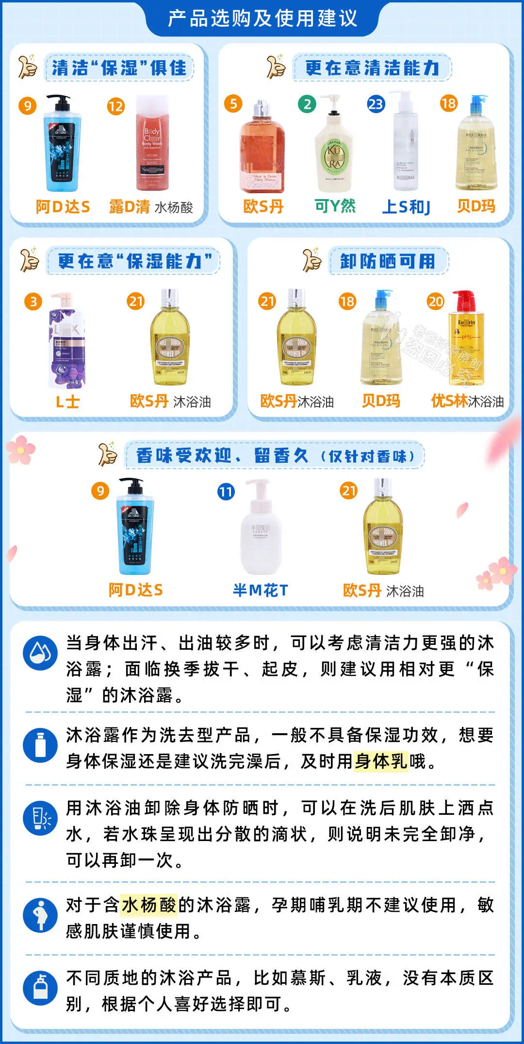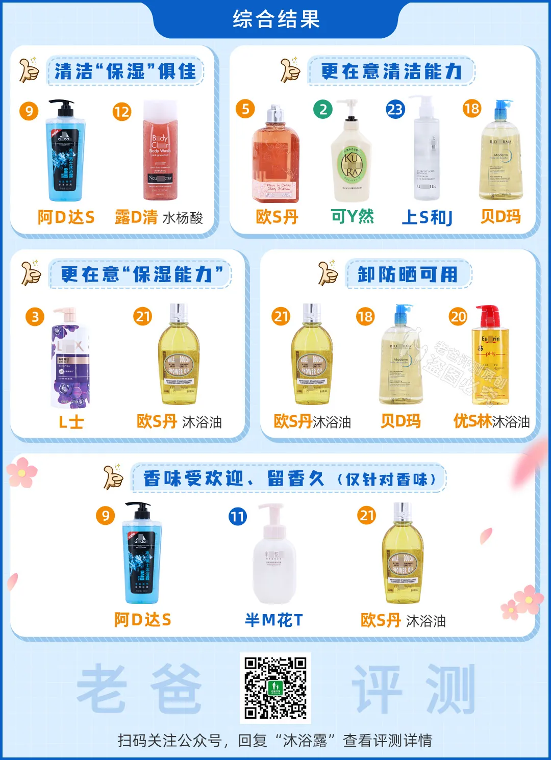9 号阿D达S、12 号露D清、3 号L士、21 号欧S丹(沐浴油)相对“保湿”一些,干皮星人和敏感肌可以考虑这几款。 不过还是那句话:“保湿”沐浴露只能让皮肤洗完不会太拔干,想要保湿的话,洗完澡要跟上身体乳嗷~