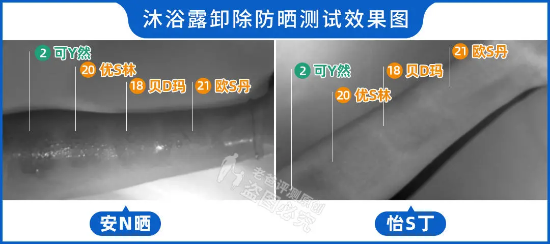 市面上很多沐浴油宣称能卸防晒,所以我们这次还测了欧S丹、贝D玛、优S林的卸防晒能力。